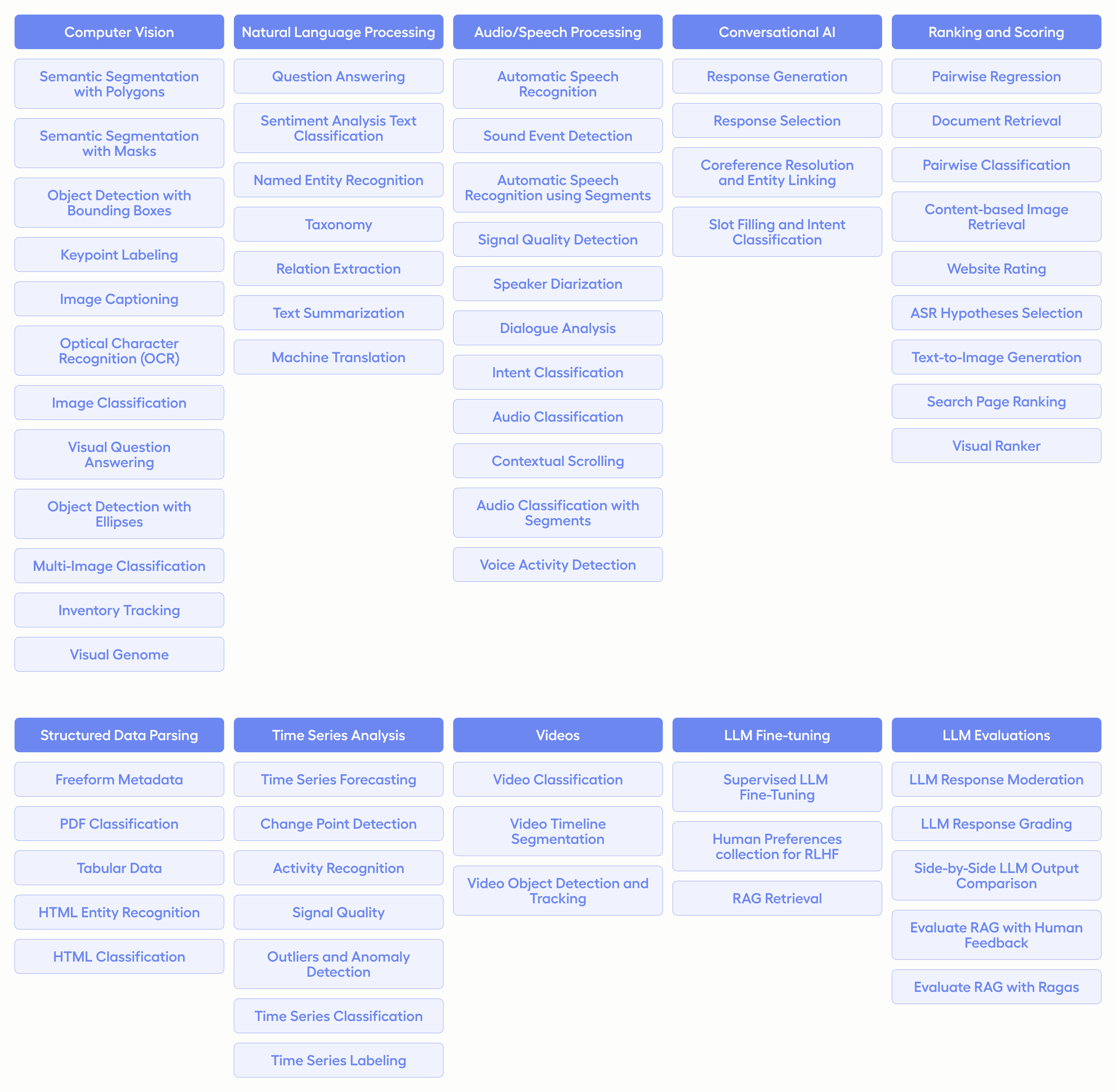 - Support for multiple data types including images, audio, text, HTML, time-series, and video.