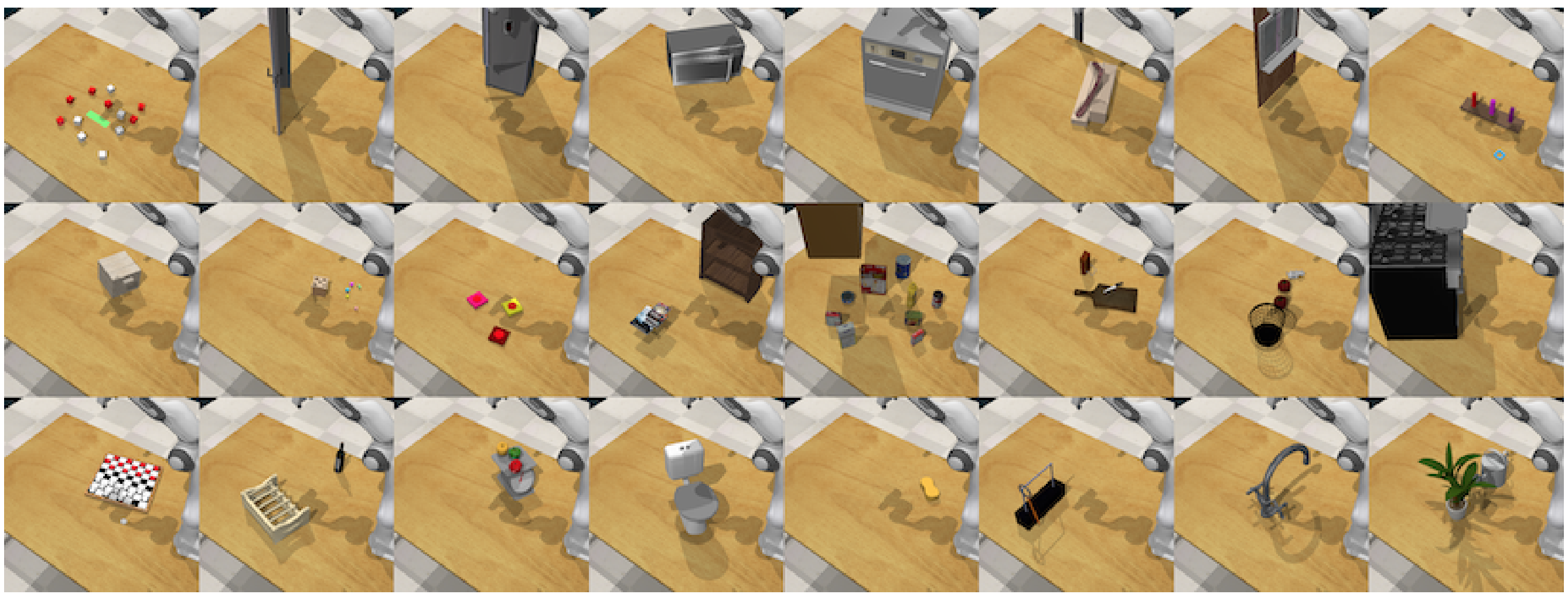 Provides a variety of train/test evaluation modes, flexible sensor suite, 4 environments and 34 diverse tasks.