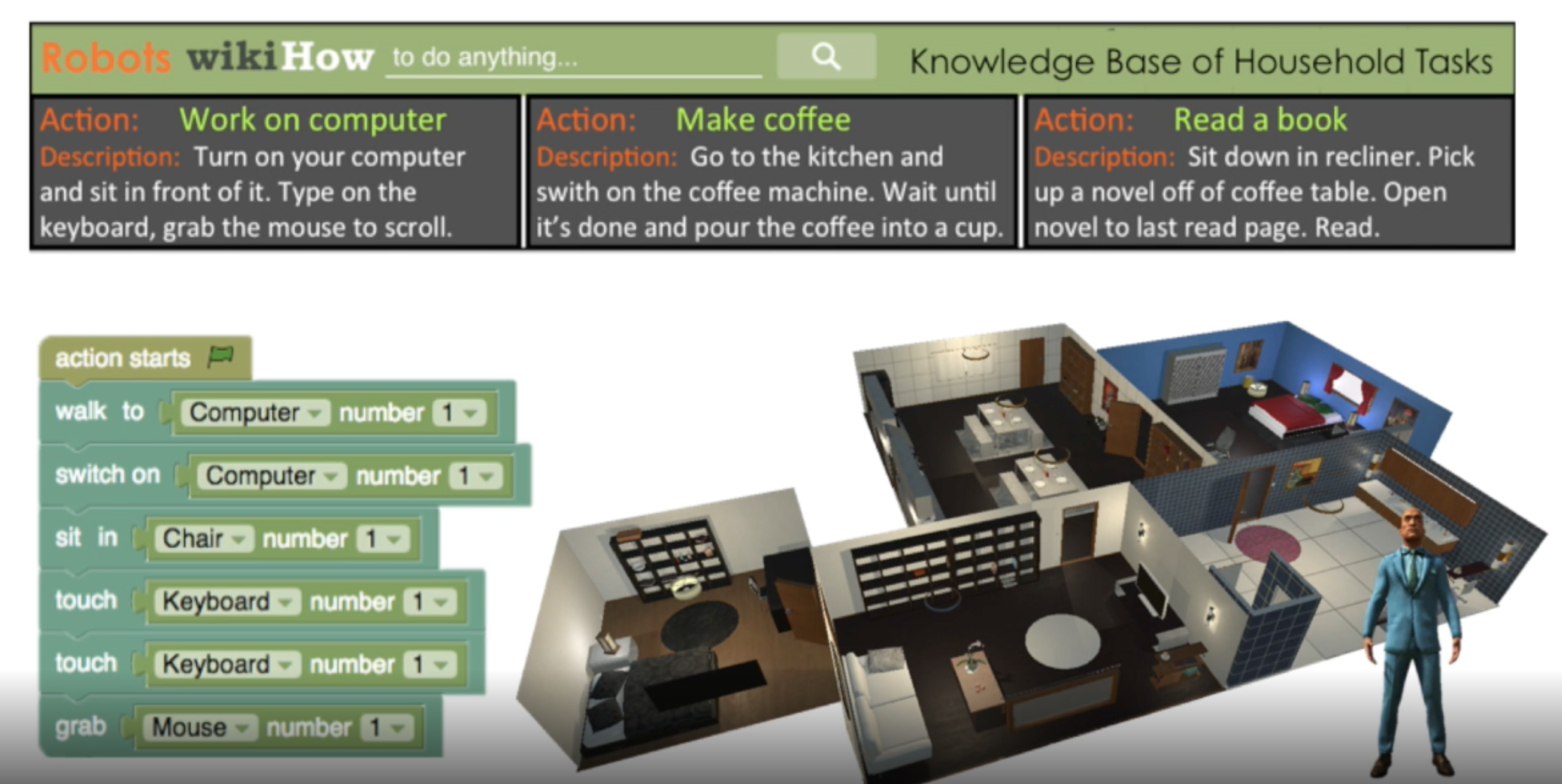 A 3D environment allowing to simulate and generate videos of activities as sequences of actions and interaction.