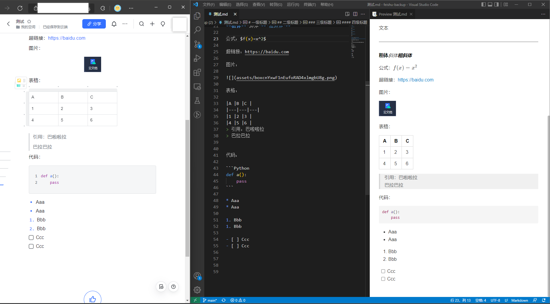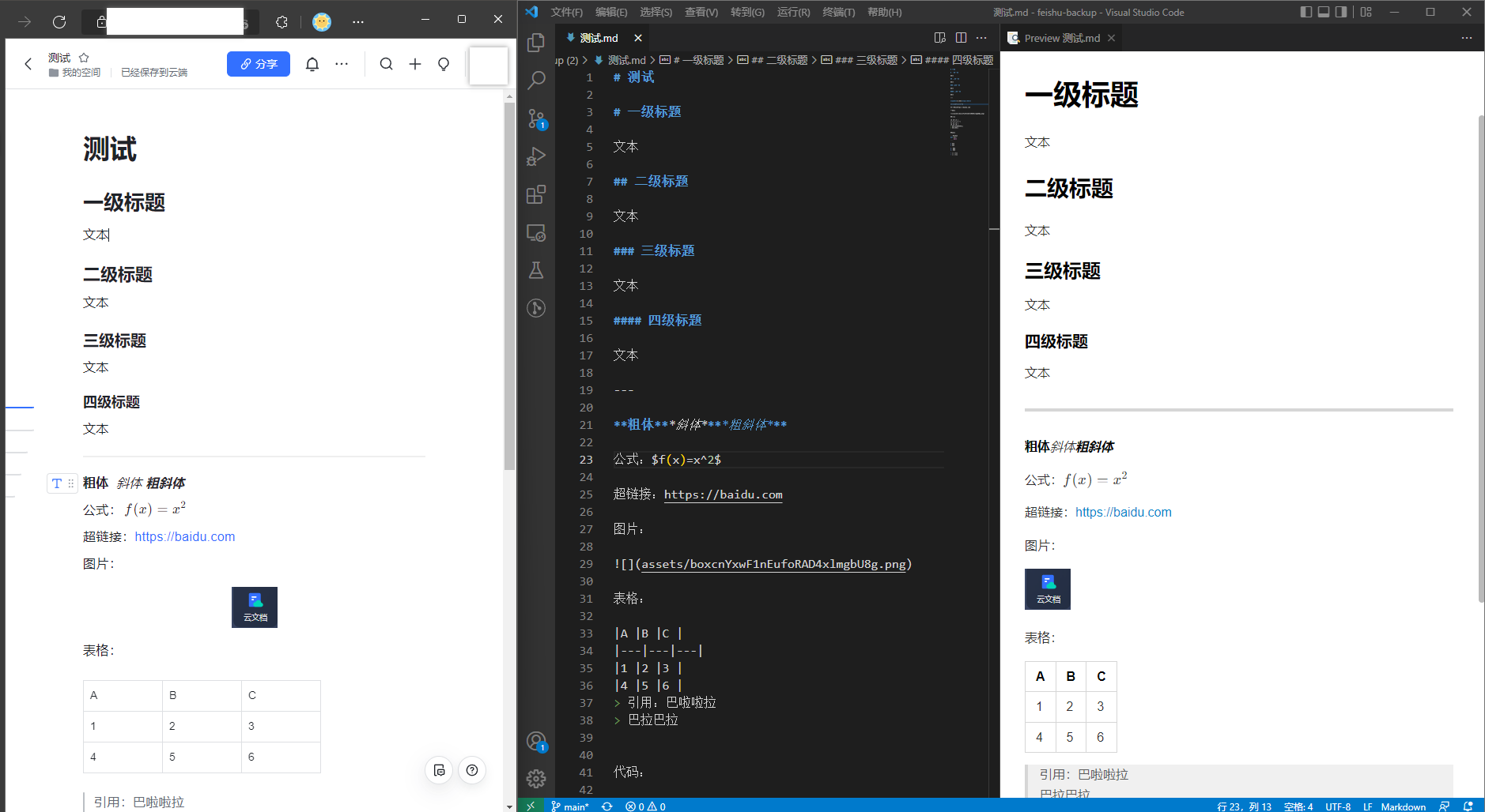 左侧是飞书文档,中间是导出的markdown,右侧是渲染后的markdown。