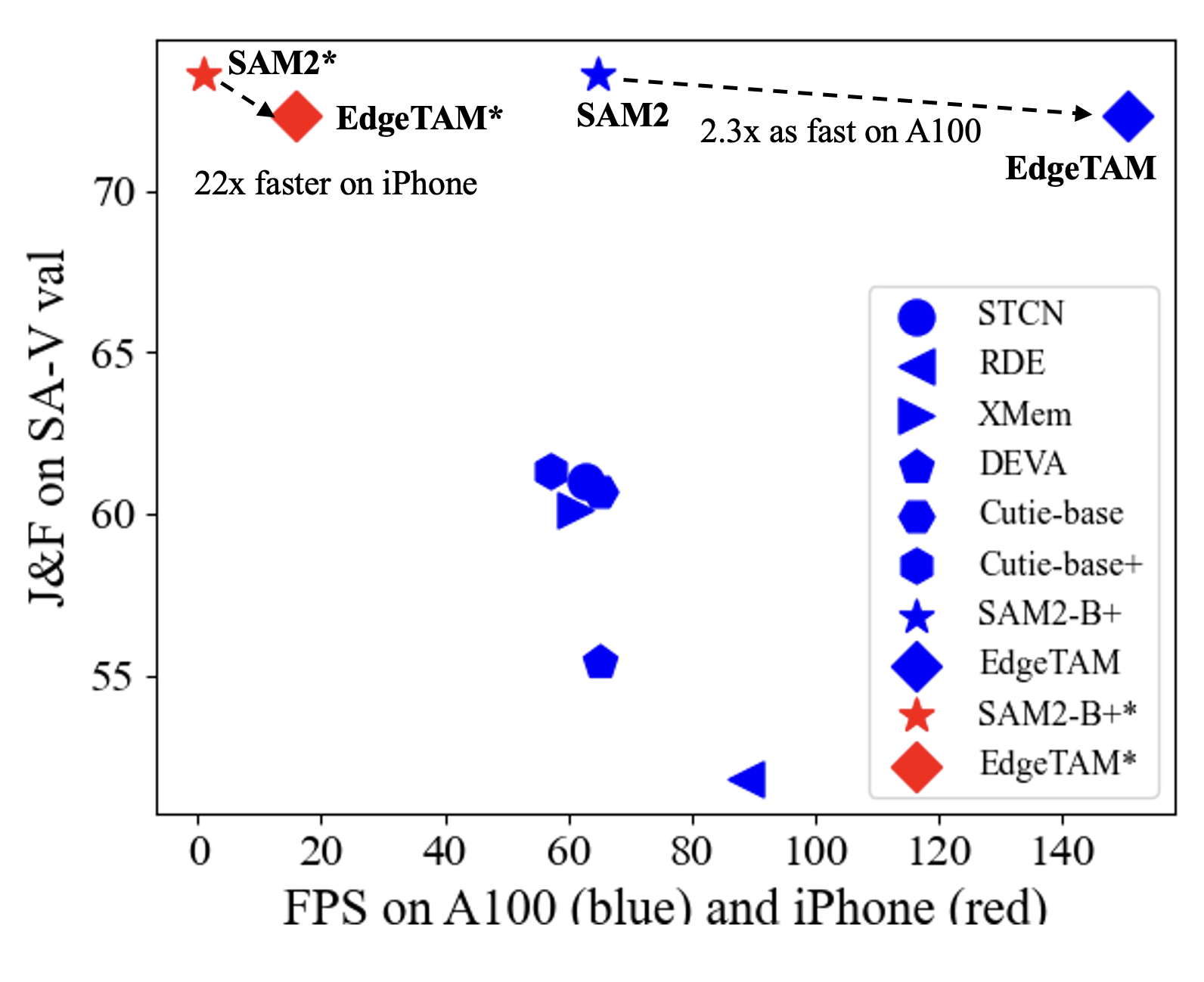 In this figure, we show the speed-performance trade-offs of EdgeTAM and other models on iPhone 15 Pro Max (red) and NVIDIA A100 (blue). We report the J&F on the SA-V val dataset as the evaluation metric.