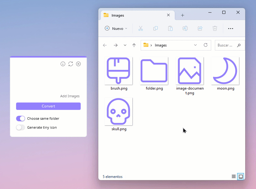 Leave the first switch on if you want to save them in the same folder, if you prefer to choose a specific folder, turn it off. You can also generate a tiny icon by turning on the second switch. Finally, click on Convert button, wait for the interface to restart because this indicates that it has finished and your icons are ready.