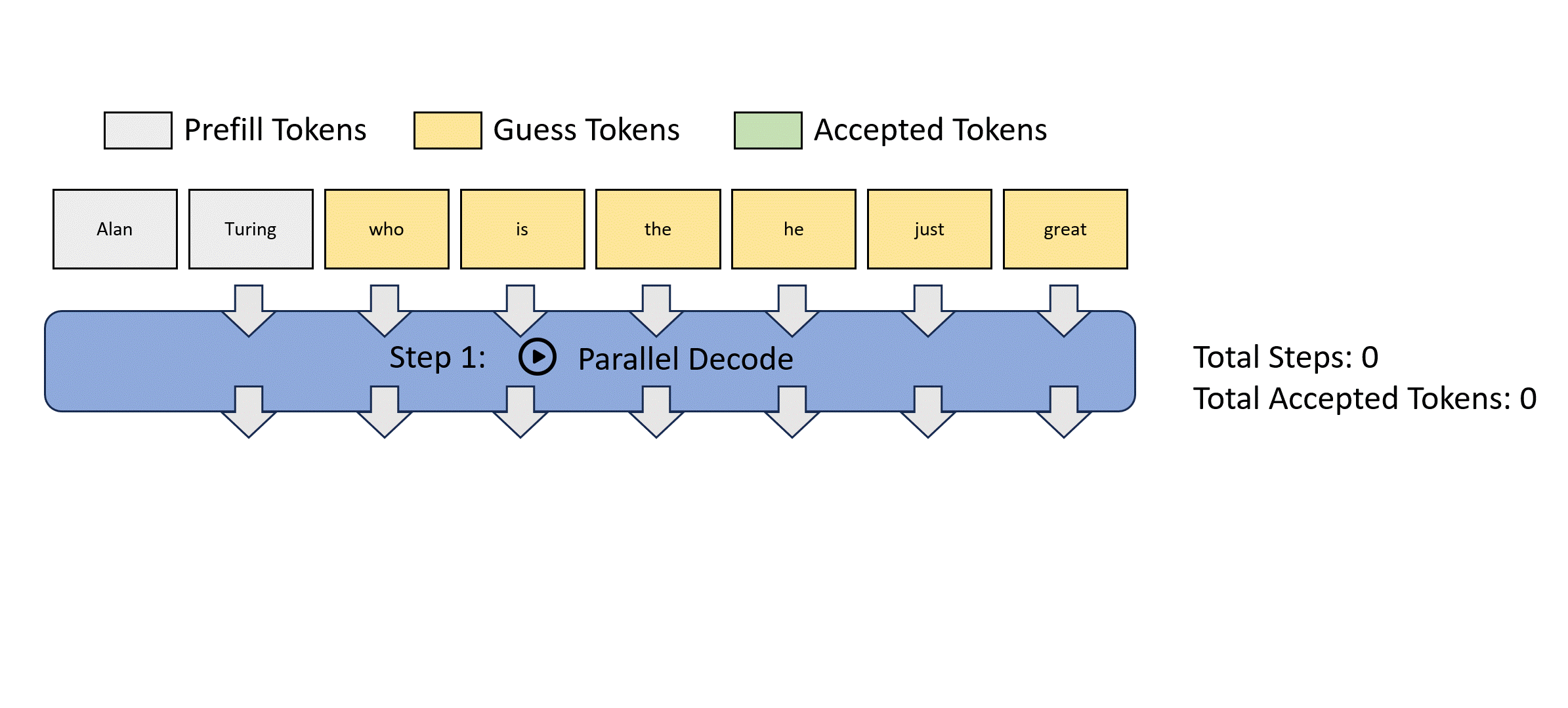 Lookahead decoding is motivated by Jacobi decoding, which views autoregressive decoding as solving nonlinear systems and decodes all future tokens simultaneously using a fixed-point iteration method. Below is a Jacobi decoding example.