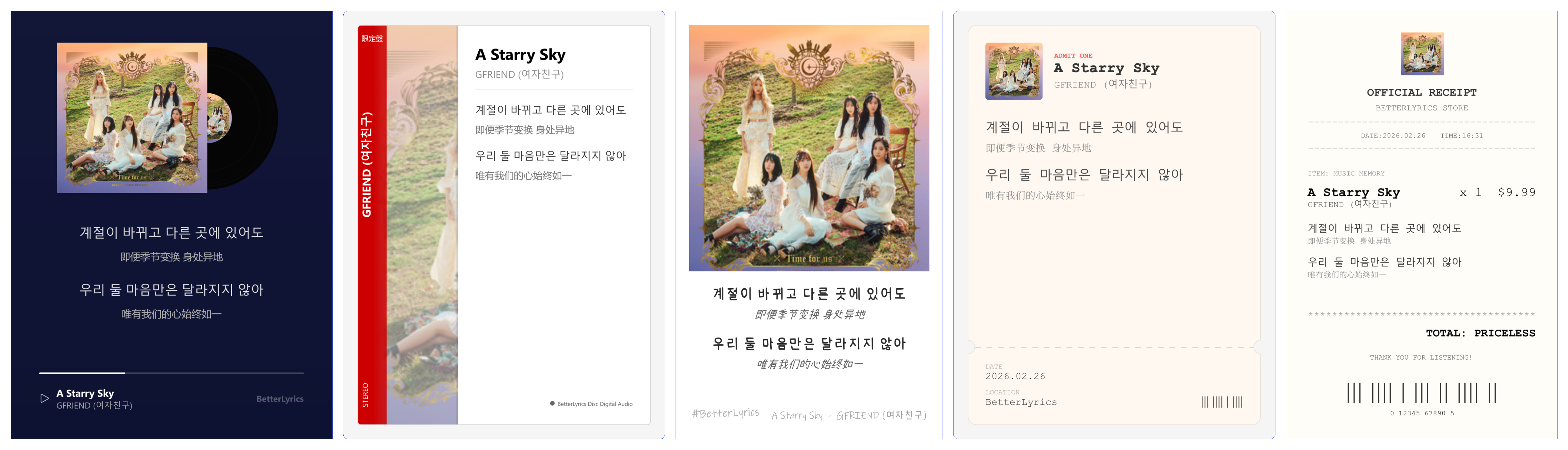 - Lyrics Cards: Generate and share gorgeous lyric cards with 10+ artistic themes (Vinyl, CD, Polaroid, Cyberpunk, and more).