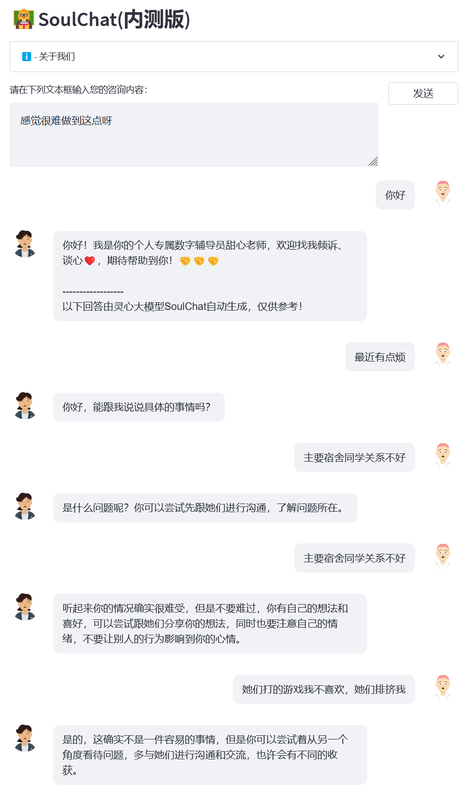本项目提供了soulchat_app.py作为SoulChat模型的使用示例,通过以下命令即可开启服务,然后,通过http://<your_ip>:9026访问。