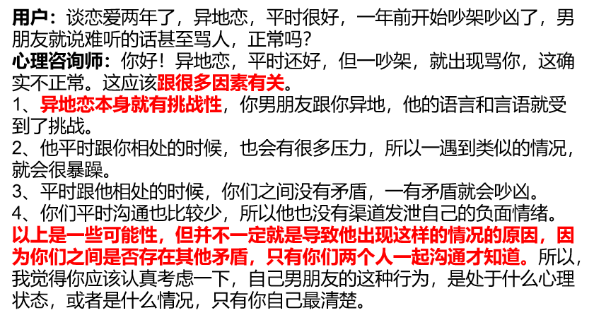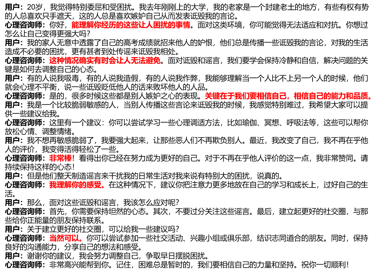 我们调研了当前常见的心理咨询平台,发现,用户寻求在线心理帮助时,通常需要进行较长篇幅地进行自我描述,然后提供帮助的心理咨询师同样地提供长篇幅的回复(见figure/single_turn.png),缺失了一个渐进式的倾诉过程。但是,在实际的心理咨询过程当中,用户和心理咨询师之间会存在多轮次的沟通过程,在该过程当中,心理咨询师会引导用户进行倾诉,并且提供共情,例如:“非常棒”、“我理解你的感受”、“当然可以”等等(见下图)。