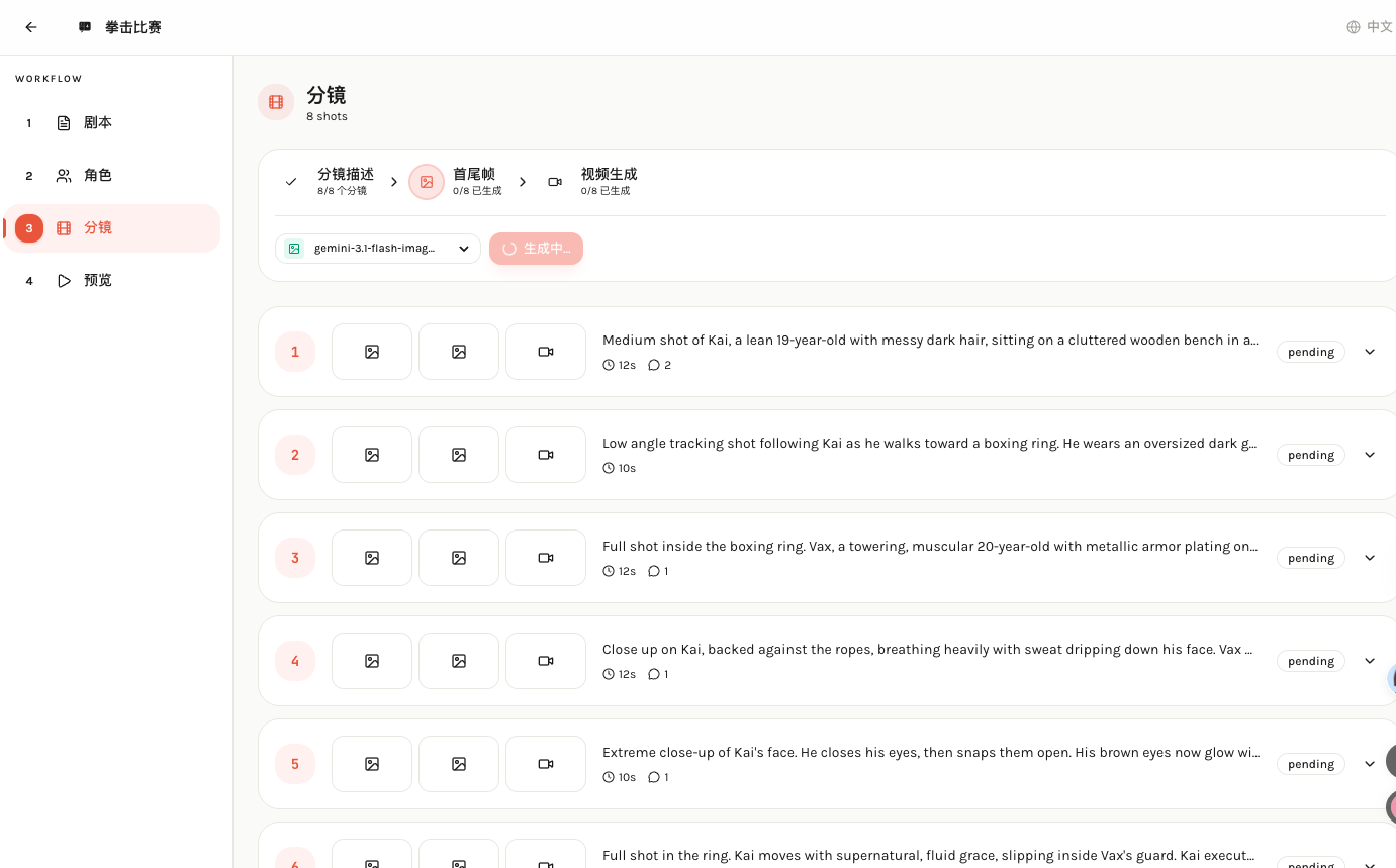 分镜页面需要一个子流程, 流程逻辑是分镜描述生成必须-- 首尾帧生成(可跳过, 需要结合分镜描述和人物三维图生成) -- 视频生成(根据首尾帧图片 + 场景描述)生成视频, 每一个分镜都有单独生成的控制, 然后最上方都需要配置批量生成