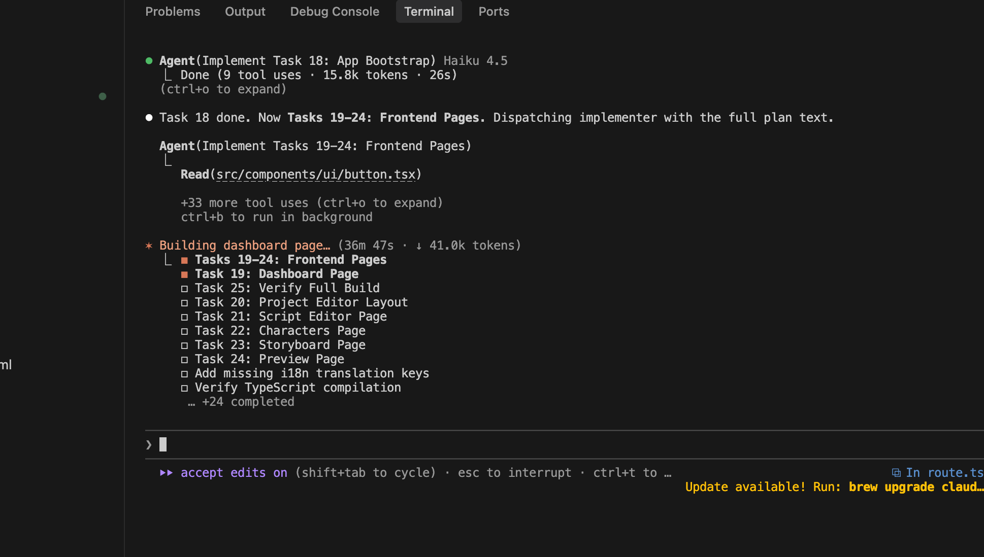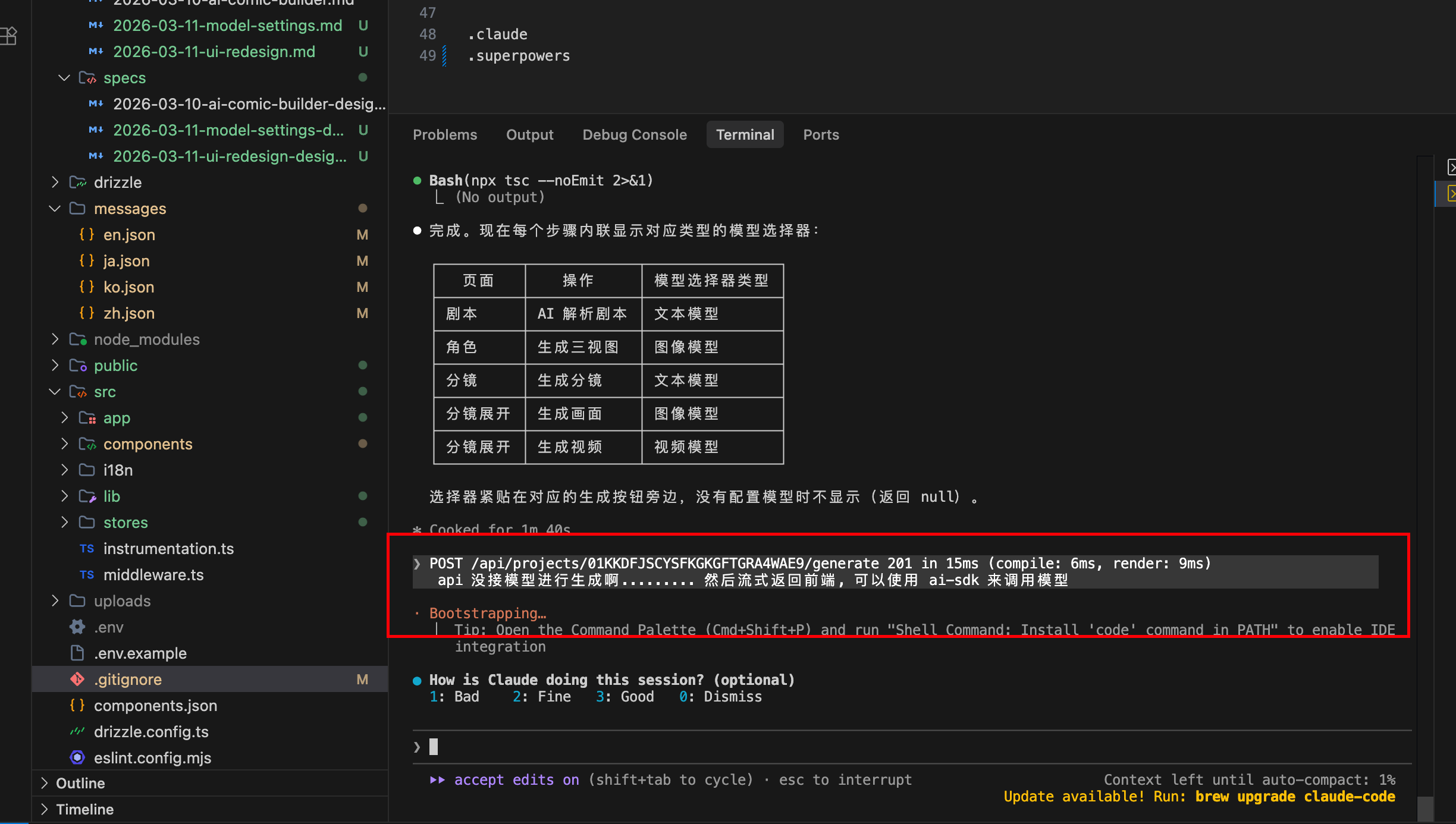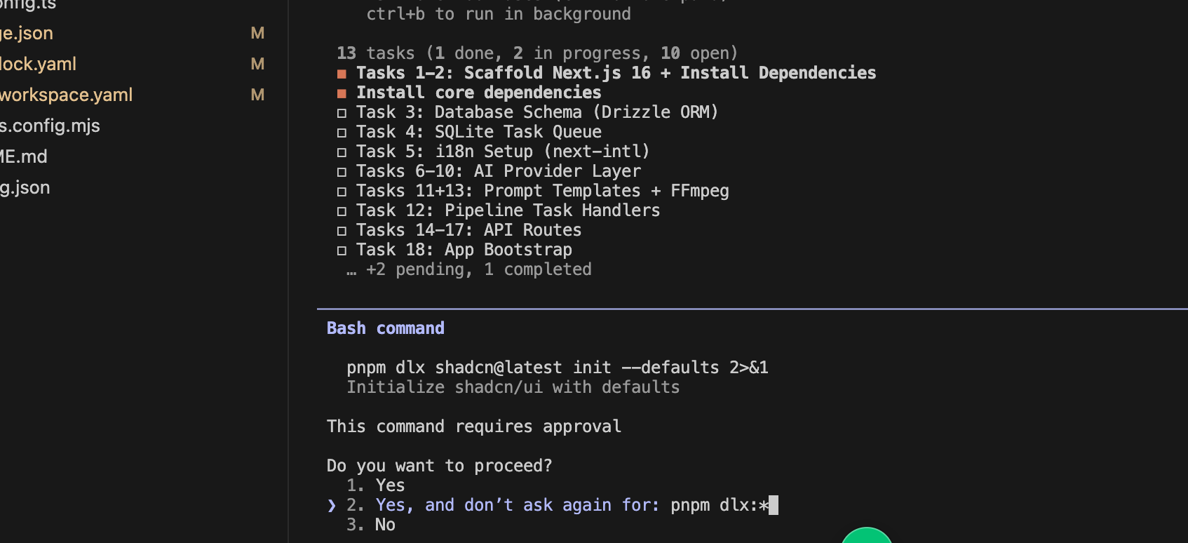 他会安装计划去完整整个项目的初始化和功能开发,过程中遇到我们需要确定的,就直接点就行。